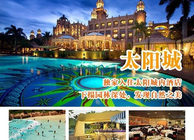 酒店早餐。前往机场,搭乘航班飞往约堡。驱车前往南半球最大的娱乐中心-太阳城。不曾身临其境,便无法真正理解太阳城给人所带来的震撼。将古老传说的神秘沧桑、非洲大陆的野性粗犷和现代生活的便利舒适那样完美地融合在一起。你可以在失落城探寻非洲大陆上最古老的秘密,根据神话传说兴建的地震桥以及豪华赌场、著名的建筑-失落城等。这里有清幽的湖光山色,无数的珍禽异草,游人可漫步其中享受。(含自由活动游览时间约3小时) 晚餐后,入住太阳城内豪华酒店,您可于太阳城内赌场大显身手。温馨提示:约堡-太阳城,约210公里,车程约3小时
