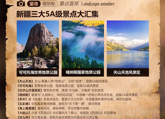 【天山天池】(含门票区间车,游览时间约2小时)古称瑶池,位于东部天山主峰博格达峰(海拔5445米)半山腰,水面海拔1910米,南北长3.5公里,东西宽0.8~1.5公里,最深处105米,平均水深60米;湖面群山环绕,云杉林立,松柏翠绿,层峦叠嶂,雪峰突显,犹如水墨画一般,甚为壮观,这里流传着西王母与周穆王的爱情故事,有诗为证:‘瑶池阿母绮窗开,黄竹歌声动地哀;八骏日行三万里,穆王何事不重来?’ 给景区增添些许神秘,乘车而上,依次可以看到:石门一线、龙潭碧月(西小天池)、定海神针、大天池(主景区)、西山观松、南山望雪等景观;【古尔班通古特沙漠】(途经沙漠边缘)也称准噶尔盆地沙漠,位于新疆准噶尔盆地中央,玛纳斯河以东及乌伦古河以南,也是中国面积最大的固定、半固定沙漠、面积有大约4.88万平方公里,在中国八大沙漠里居第二,海拔300~600米,水源较多。【卡拉麦里有蹄类自然保护区】(途经)根据新疆维吾尔自治区人民政府1982年批文建立,总面积为1733000公顷,主要保护珍稀动物资源及其生态环境,卡拉麦里自然保护区是新疆有蹄类野生动物主要活动区域,20世纪80年代设立保护区以来,蒙古野驴、鹅喉羚等野生动物明显增多,普氏野马自2001年首次放野以来逐渐适应野外生活,成为卡拉麦里自然保护区的一道美丽的风景。