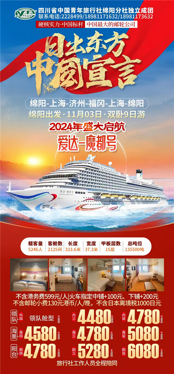 绵阳中旅假日旅行社于2024年10月9日在市工会大厦成功举行“爱达·魔都号豪华邮轮9日游”旅游线路推荐会。现场主持人向到场的嘉宾们详细的介绍了济州、福冈等地的风土人民、美食、美景以及出游的相关注意事项等内容,受到了嘉宾们的热烈欢迎和关注。服务热线:0816-2228499/2238477 。