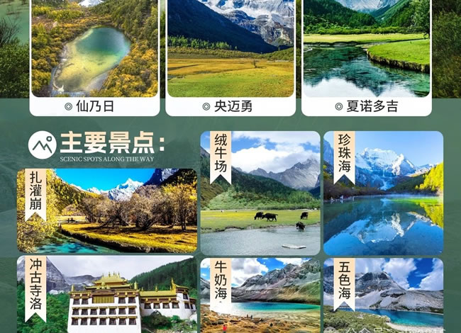 早上:7:00 早餐后乘车经波瓦山到达【亚丁景区】(门票已含,首次观光车 120/人自理,必须消费),后在游客接待中心换乘景区观光车抵达亚丁景区【扎灌崩】(40 公里,车程 1.5 小时),下车后游 客徒步上山直接抵达冲古寺。 中午:景区中餐自理,观赏冲古寺风光及神山仙乃日风光,然后可自费乘坐电瓶车(自理往返 70/人,单程 40/人)前往【洛绒牛场】(如徒步需 1-2 小时左右达到洛绒牛场)。这里是观【夏诺多吉神山】(意为金刚手菩萨,海拔 5958 米)【央迈勇神山】(意为金文殊菩萨,海拔 5958 米)的最佳地点,让神山圣水与心共鸣,尽情沉醉在梦幻之地,后原路返回,到达【扎罐崩】乘观光车返回住宿地。 晚上:回到日瓦镇或稻城,晚餐后入住酒店。温馨提示:因当天游客出景区时间不统一,所以旅游车无法统一接送游客,游客可以选择乘坐当地公交车(5-10元/人自理)。亚丁景区分长线—牛奶海、五色海和短线—珍珠海游览。长线游览:因牛奶海和五色海海拔高,客人务必根据自身实际情况选择是否前往(可选择自费骑马305元/人至舍身崖约1.5小时,再徒步至牛奶海和五色海需约1.5小时,冬季11中旬至次年3约中旬马帮停运,需徒步单程5KM往返10KM,徒步往返时间约4.5小时)到达【牛奶海】,再徒步前往【五色海】(徒步约20分钟);【牛奶海】海拔4800米,又叫洛绒措,古冰川湖,状如水滴,四周雪山环绕,湖水清莹碧蓝,山止成瀑,以其玲珑秀雅水色翠蓝而著名。牛奶海在央迈勇的山坳里,呈扇贝形,中间是碧蓝的雪水,周边则是一圈乳白色环绕,这圈乳白色大致就是牛奶海名称的由来。牛奶海是美丽的,远远望去,仿佛碧玉镶嵌在雪山之中,纯净安详。纯净的湖水给人以平和安宁的心境,而蓝湛湛的海子并不透明,显得神秘莫测。传说能治聋哑病的圣湖。【五色海】海拔4600米,由于光的折射下,产生五种不同颜色而得名:其真名为“登崇措”。五色海它位于仙乃日与央迈勇之间,湖面呈圆形。面积0.7公顷,现代冰谷下伸至湖畔,雪山倒影湖面,呈现奇幻的色彩。是藏区著名的圣湖(佛经中赞誉该湖与西藏羊巴雍措齐名),据传能“返演历史,预测未来”。短线游览:游客可乘坐景区观光车抵达扎灌崩,徒步500米到达冲古寺,前往仙乃日神山下的圣湖【珍珠海】短线游览(单程约1.5KM,徒步前往约40分钟),海拔3950米。【珍珠海】在藏语中称为“卓玛拉措”,是仙乃日的融雪形成的海子。面积约0.1平方公里。密林中的珍珠海如一颗镶嵌在莲花宝座上的绿宝石,碧波荡漾,粼粼波光中透出无限清丽,湖畔四周,参翠如屏。春天湖边片片杜鹃花灿烂怒放,秋天层林尽染,倒影着五彩斑斓的世界,令人目眩神迷。【亚丁景区】以仙乃日、央迈勇、夏诺多吉三座雪峰为核心区,北南向分布,三座雪山呈品字形,三峰藏名为“念青贡嘎日松贡布”,意为“三怙主雪山”,是众生朝圣积德之所在地。由于特殊的地理环境和自然气候,形成了独特的地貌和自然景观,是中国保存最完整的一处自然生态系统。